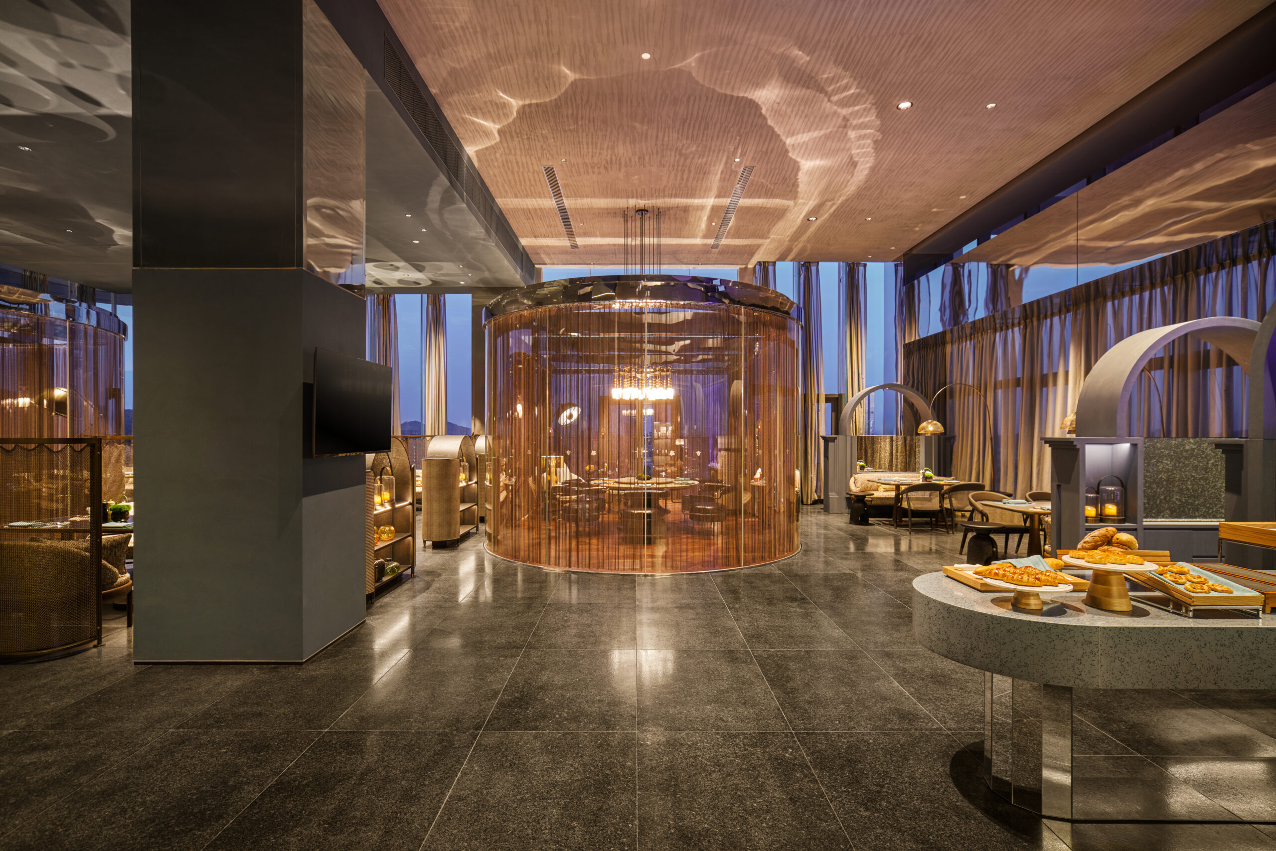 位于23层的乐飨餐厅主理现代粤式美馔,于摩登语汇中重塑岭南风味,搭配可俯瞰珠海天际线的露台,带来兼具格调与烟火的赏味体验。中餐厅以广府文化为韵,六间雅致包房演绎岭南艺术意境。一席盛宴,尽显珠海的在地风情与人文雅趣。酒廊则以岭南砖墙与现代设计交织,白昼可享广府茶点与下午茶,入夜以“暮光柑橘”等特调鸡尾酒与乐队演出,共享旖旎夜色。