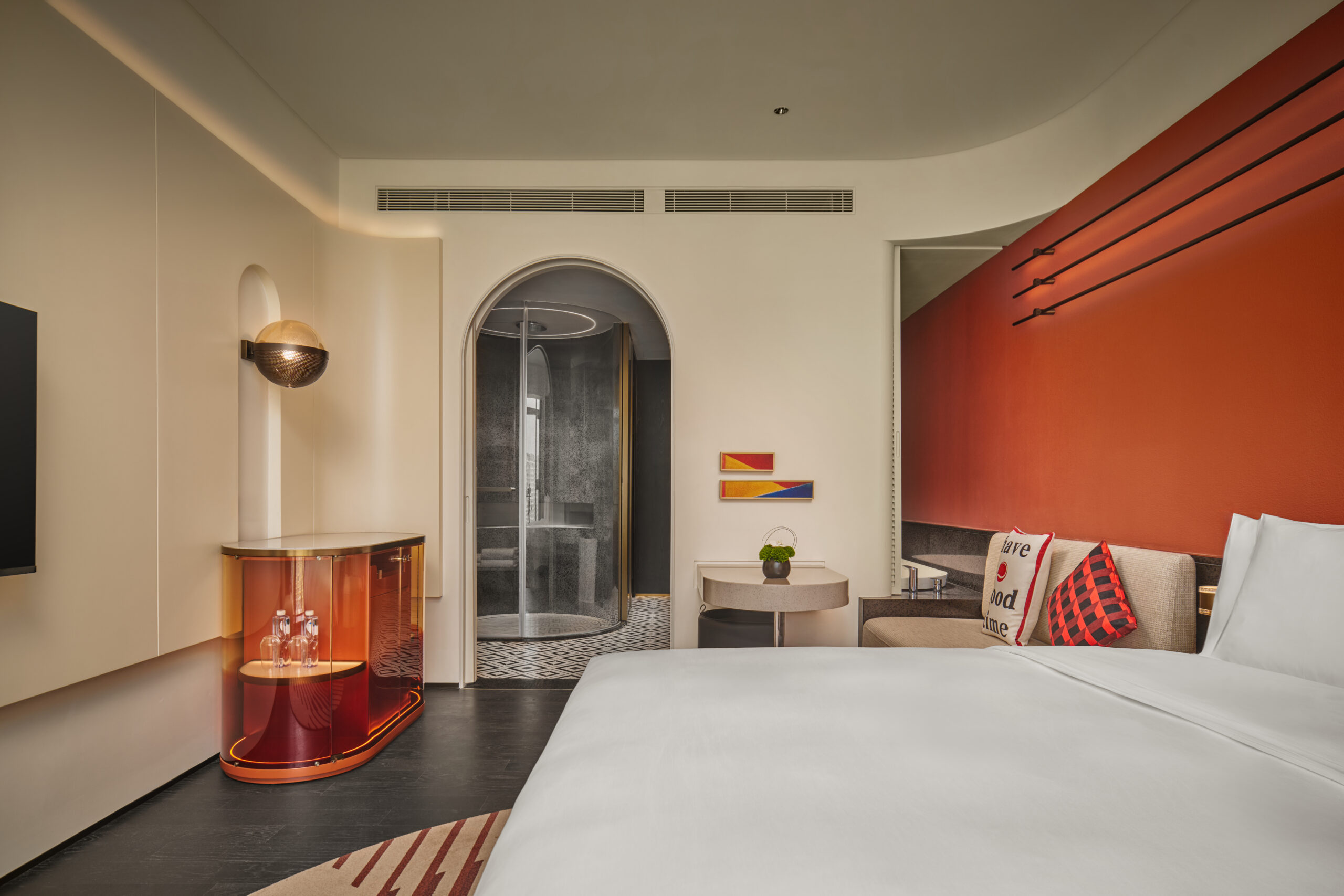 “越洋逐梦,潮动侨香。”酒店总经理银杰先生表示:“我们希望透过英迪格独特的设计语言,让宾客在旅程的每一刻都能感受到香洲的邻间温度与在地文化的魅力。酒店不仅是一处栖息之所,更是一段连接城市故事、激发创意灵感的旅居体验。”酒店设计灵感取自香山文化多元包容的气质与南洋文化的开放精神。以“传统与潮流交汇”为主线,将岭南砖墙、南洋百叶窗的斑驳光影与现代线条融合,勾勒出兼具侨乡底蕴与都市活力的灵感空间。于入口处以富有地域记忆的红砖墙铺陈开场,层叠的肌理如同诉说着老香洲的街巷故事;步入大堂,拱门形态的南洋元素与乒乓球接待台意象相互辉映,在光影流转中闪烁着温润金辉,唤醒那段梦想熠熠的岁月风华。