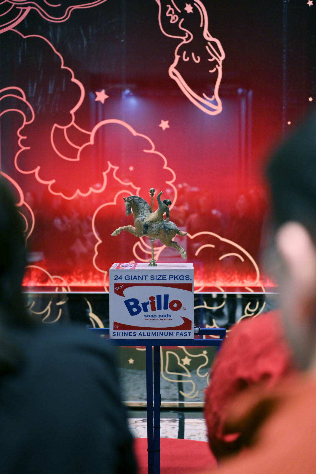 位于壁炉正前方,是艺术家张翀创作的装置——《和平年代》。这件作品构思精巧,蕴含多层对话:其上端是一件复刻精制的唐代马球俑,它姿态生动,承载着中国中古时期蓬勃昂扬的时代精神与精湛的古典艺术造诣;其底座则是一个标志性的Brillo盒子,此物件源于安迪·沃霍尔的波普艺术,象征着二十世纪消费社会与大众文化景观。作品通过“唐代马俑的东方美学和Brillo盒子的波普艺术,层层意象叠加,生动诠释了在当今和平岁月下,不同时代、不同文明的美学符号如何能够和谐共鸣,共奏一曲关于历史、文化与生活之美的乐章。